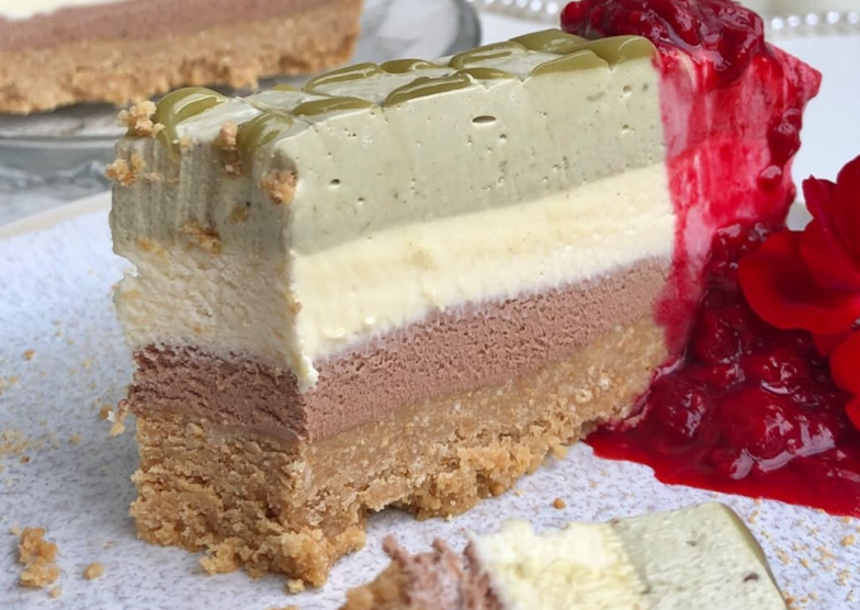 Radi se o slojevitoj poslastici — baza od mlevenog keksa, tri različita fila (mlečna čokolada, bela čokolada i pistać krem) i završni sloj šlaga koji kolač drži laganim i elegantnim. Jednostavan je za pripremu, ne peče se (osim eventualnog zagrevanja na pari) i daje odlične rezultate čak i onima koji se ne smatraju iskusnim poslastičarima.
