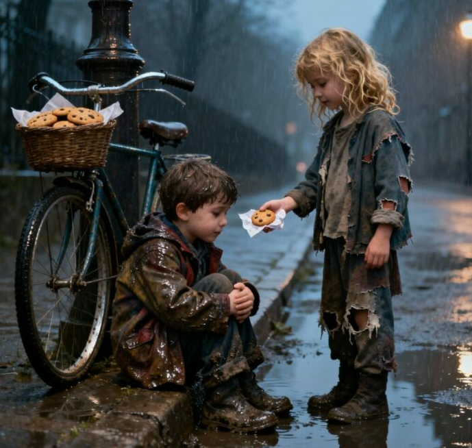 Na ivici trotoara, u gustoj kiši, sedeo je dečak od svega pet godina. Bio je: