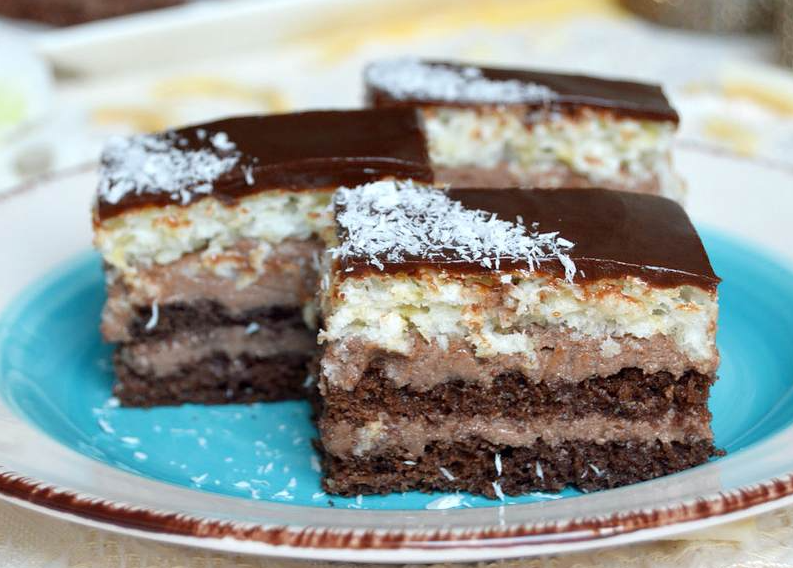 Po želji, možete rasporediti slojeve i drugačije – na primer, kokos koru staviti između dve tamne, ako želite jači čokoladni naglasak.