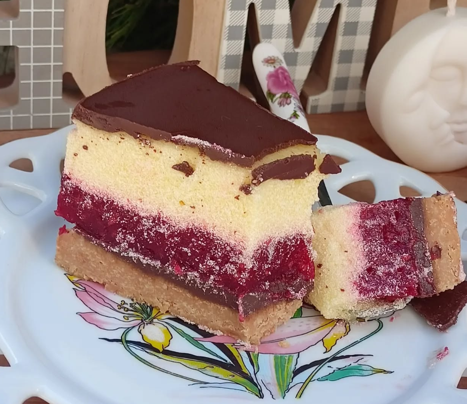 Kada se prohladi, voćni fil se nežno izliva preko sloja čokolade i vraća u frižider da se stegne. Ovaj sloj donosi torti svežinu, blagu kiselkastu notu i predivnu boju.