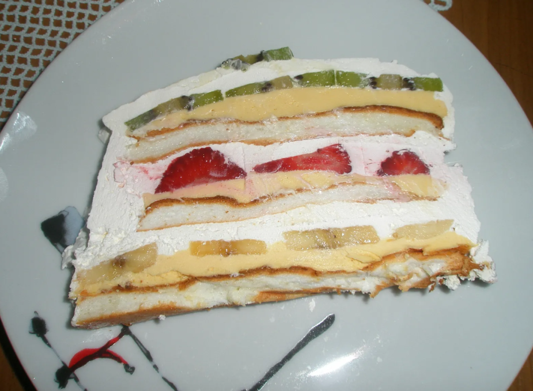 2. Premažite dobro kremom, zatim složite red banana (preporučeno) ili rasporedite jagode/kivi po površini.
