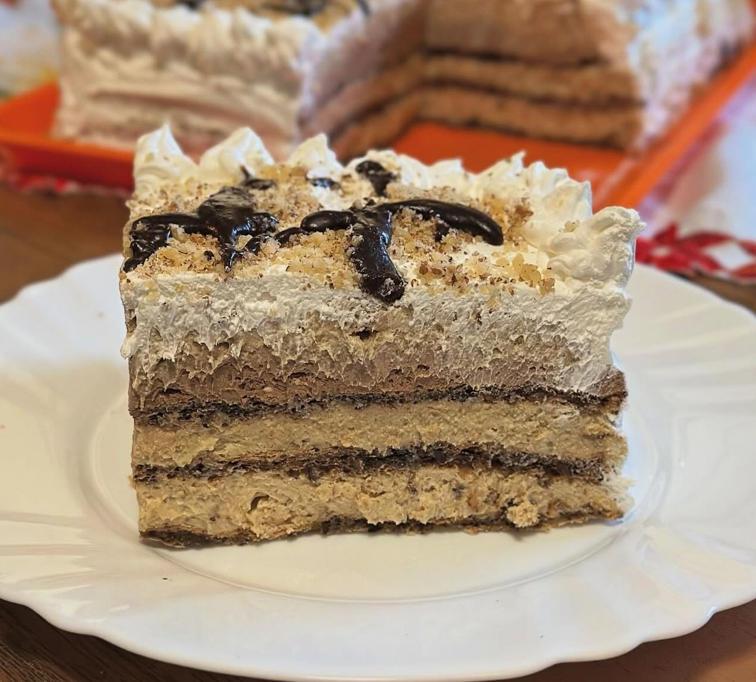 Za razliku od jednostavnih biskvitnih kolača, ovde se kombinuju tri različite vrste kora i tri različite vrste fila, a na kraju sve biva zaokruženo šlagom koji daje notu svežine i lakoće. Torta je spoj orašastih plodova, voćnih nota, keksa, čokolade i mlečnog krema, što je čini univerzalnim izborom – pogodna je i za one koji vole klasične ukuse, i za one koji traže nešto nesvakidašnje.