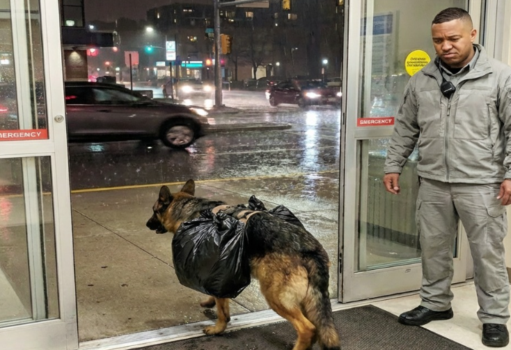 Unutra je utrčao veliki njemački ovčar, potpuno mokar od kiše. Ono što je dodatno privuklo pažnju bio je crni paket koji je nosio na leđima.