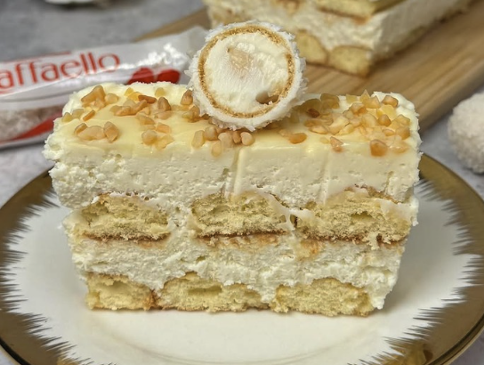 Ovaj recept je za laganu, bez pečenja verziju slasnog deserta inspirisanog Raffaello bombonima — kombinacija kremaste teksture, bijele čokolade, kokosa i hrskavih badema. Pripremljen u kalupu prečnika 26 cm, ovaj kolač zahteva malo vremena za sastavljanje, ali malo strpljenja za hlađenje — rezultat je osvežavajući, nežan i elegantan desert koji izgleda i miriše raskošno.
