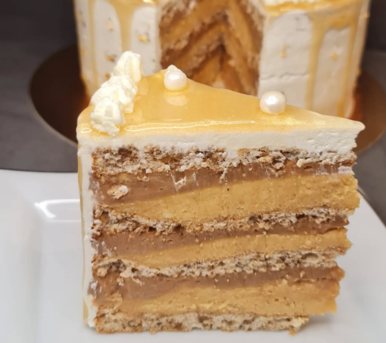 4. Ponovite za treću koru (plazma fil), pa četvrtu koru završite kako želite — mnogi stavljaju karamelni ili dodatni sloj plazme na vrh, ali originalno se obično završava s jednim od fila i kasnije ukrašava šlagom.