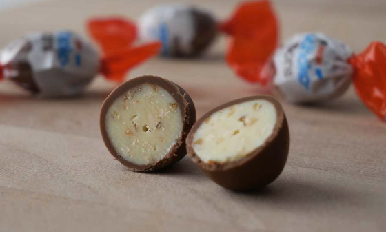 Paralelno, bela čokolada se topi, a zatim lagano hladi kako bi se mogla umešati u kremastu smesu. Dodavanje Schoko-bons bombona, koje su prethodno usitnjene, unosi u kremu dodatnu dozu karakteristične mlečno-čokoladne arome.
